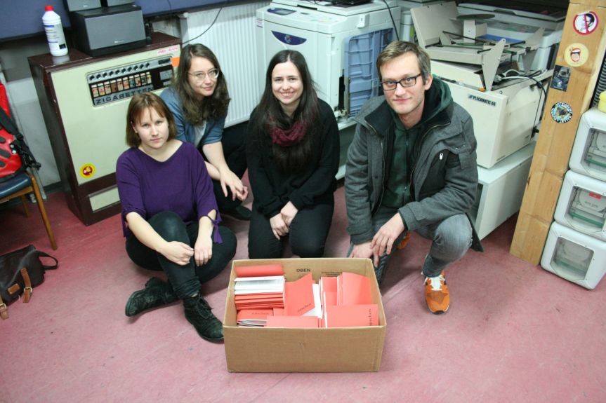 Foto © mischen. Ein Teil des ‚mischen‘- Kollektivs (Julia Knaß, Bianca Rexeis, Kathrin Pflegerl und Raffael Hiden) nach dem Druck des ersten Heftes“.
