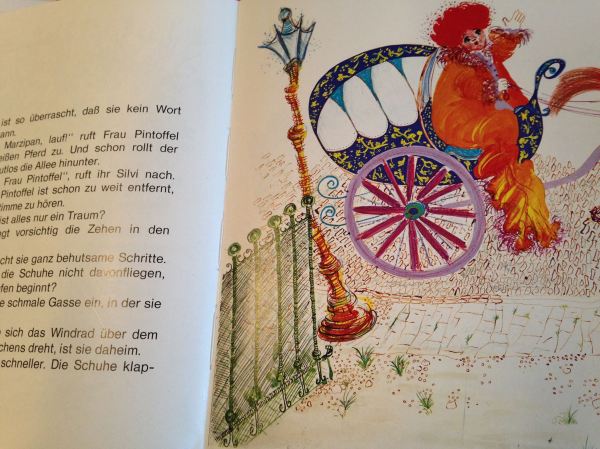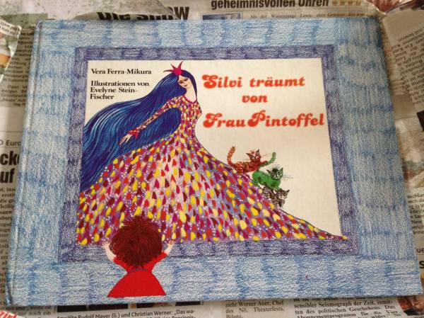 Weiter zurück liegt meine Erinnerung an Vera Ferra-Mikuras „Silvi träumt von Frau Pintoffel“. Ich hatte jahrelang schemenhafte Bilder im Kopf von einem Buch aus meiner unter dicken Zeitschichten verborgenen Kindheit. Diese Bilder tauchten immer wieder auf, ich konnte sie nicht zuordnen – bis ich eines Tages beim Herumgoogeln über Vera Ferra-Mikura auf ein Foto des Einbands stieß und es „Bäm!“ machte. Ich konnte ein Exemplar davon in einem Antiquariat ergattern, es war in Zeitungspapier gewickelt, als es ankam (siehe Foto). Als ich es durchblätterte, kamen mir die Tränen. Mein Großvater, der vor einigen Jahren gestorben ist, hat es mir oft vorgelesen und mich aus den Buchseiten heraus so viele Jahre später kurz besucht.