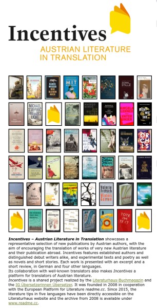Im Jahr 2008 wurde mit Incentives ein gemeinsames Projekt des Literaturhaus-Buchmagazins und der IG Übersetzerinnen Übersetzer in Zusammenarbeit mit der Europäischen Literaturplattform readme.cc gestartet. Zwei Mal im Jahr stellt Incentives – Austrian Literature in Translation eine repräsentative Auswahl von
