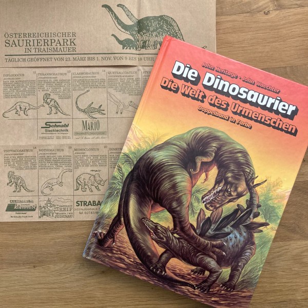 Beim erneuten Durchblättern ist mir eine Broschüre vom Saurierpark in Traismauer untergekommen, den ich damals (es muss um 1993 herum gewesen sein, im selben Jahr, in dem auch Jurassic Park ins Kino gekommen ist) mit meiner Familie besucht habe. Ich erinnere mich an die – aus kindlicher Perspektive riesigen – Nachbildungen, dass ein Besteigen der Modelle eigentlich verboten war, meine Schwester und ich uns trotzdem kurz auf den Diplodocus setzen durften. Und gäbe es kein Beweisfoto, hätte ich diesen Moment vielleicht auch schon wieder vergessen.