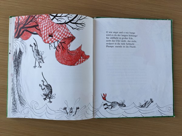 Aus 30 Jahren Entfernung nachzuvollziehen, was genau es war, das mich so an diesem Buch fasziniert hat, ist schwer – Erinnerung und Erzählungen überlagern sich. Dass man zusammen mehr erreichen kann, dass man Verletzten und Schwächeren unbedingt helfen muss, mag ich nebenbei mitgenommen haben. Viel mehr dürften mich aber die lebendigen Stofftiere und Spielzeuge und das Leben im Wald (mit gefährlichen Wespen und ihren schmerzhaften Stichen!) interessiert haben. Die Reime habe ich streckenweise mitgesprochen und dabei auch Fehler beim Vorlesen korrigiert, wird mir erzählt.