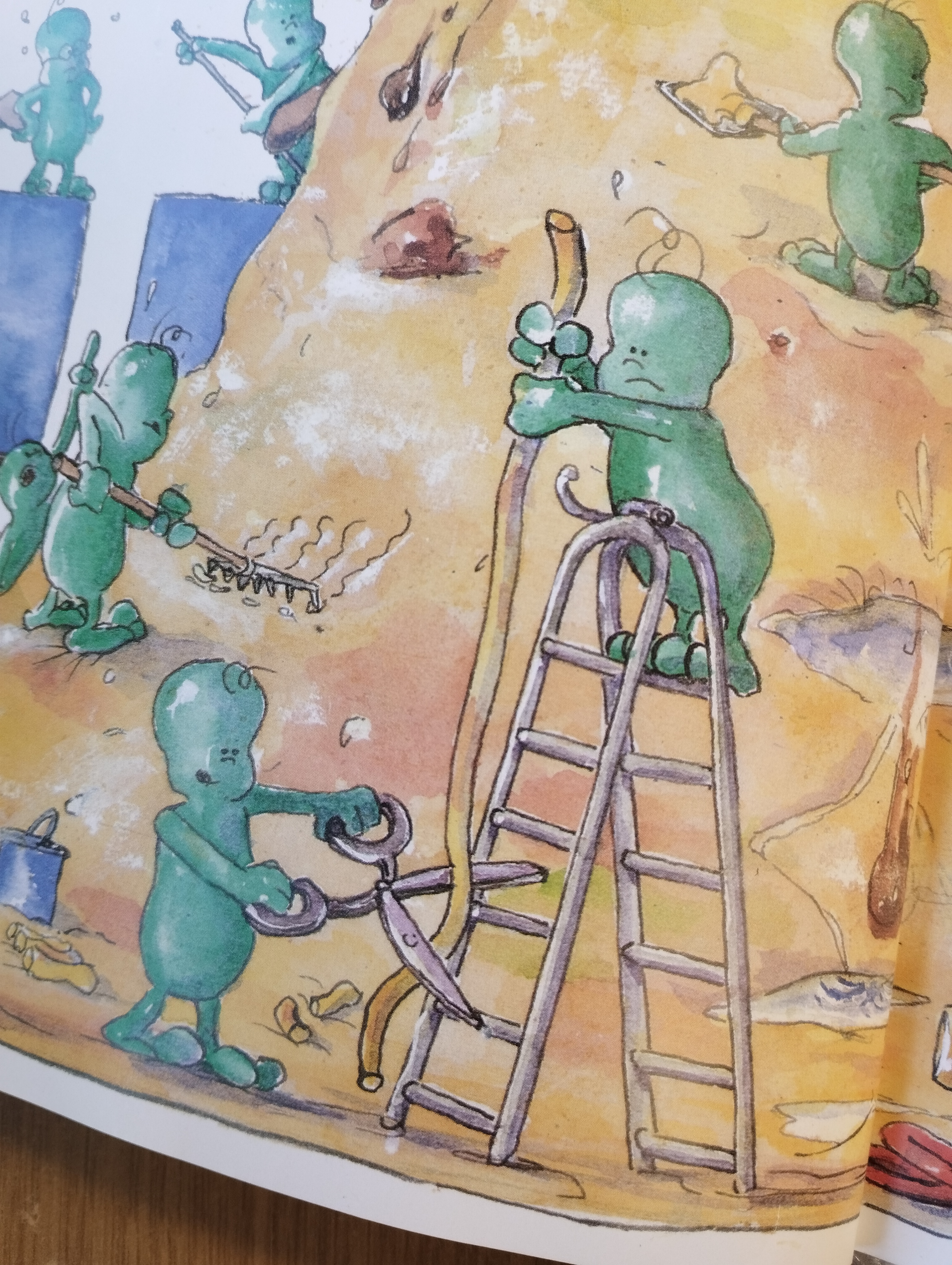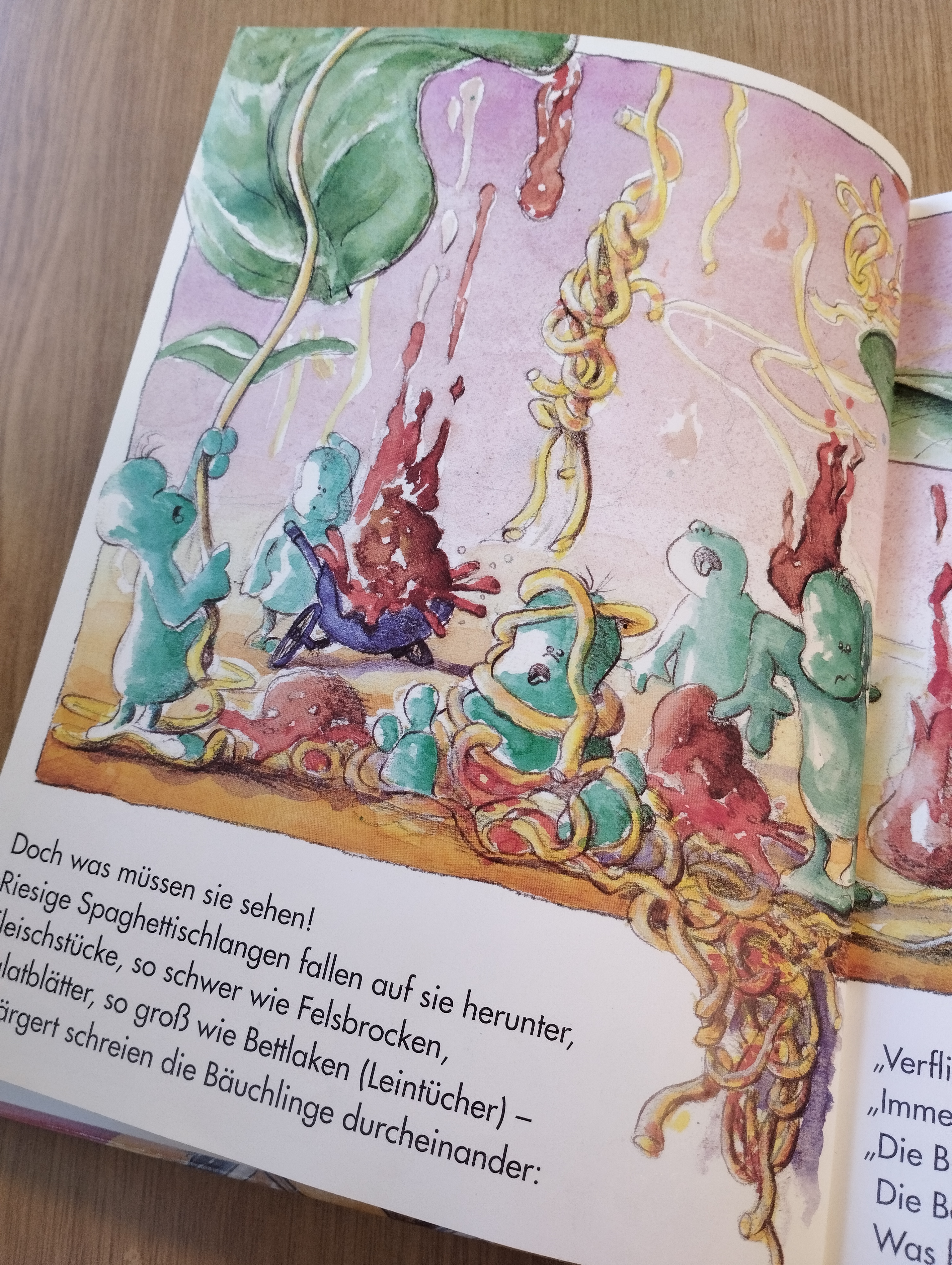 Natürlich wäre es schön, wenn vorne und hinten die Beispiele für gesundes und ungesundes Essen auch vermitteln würden, dass ein Eis oder ein Gummibärchen ab und zu schon okay sind und es nicht ausschließlich Brokkoli und Apfelspalten sein müssen, aber trotzdem finde ich das Buch auch aus heutiger Sicht nicht moralisierend und sehr gut gealtert.