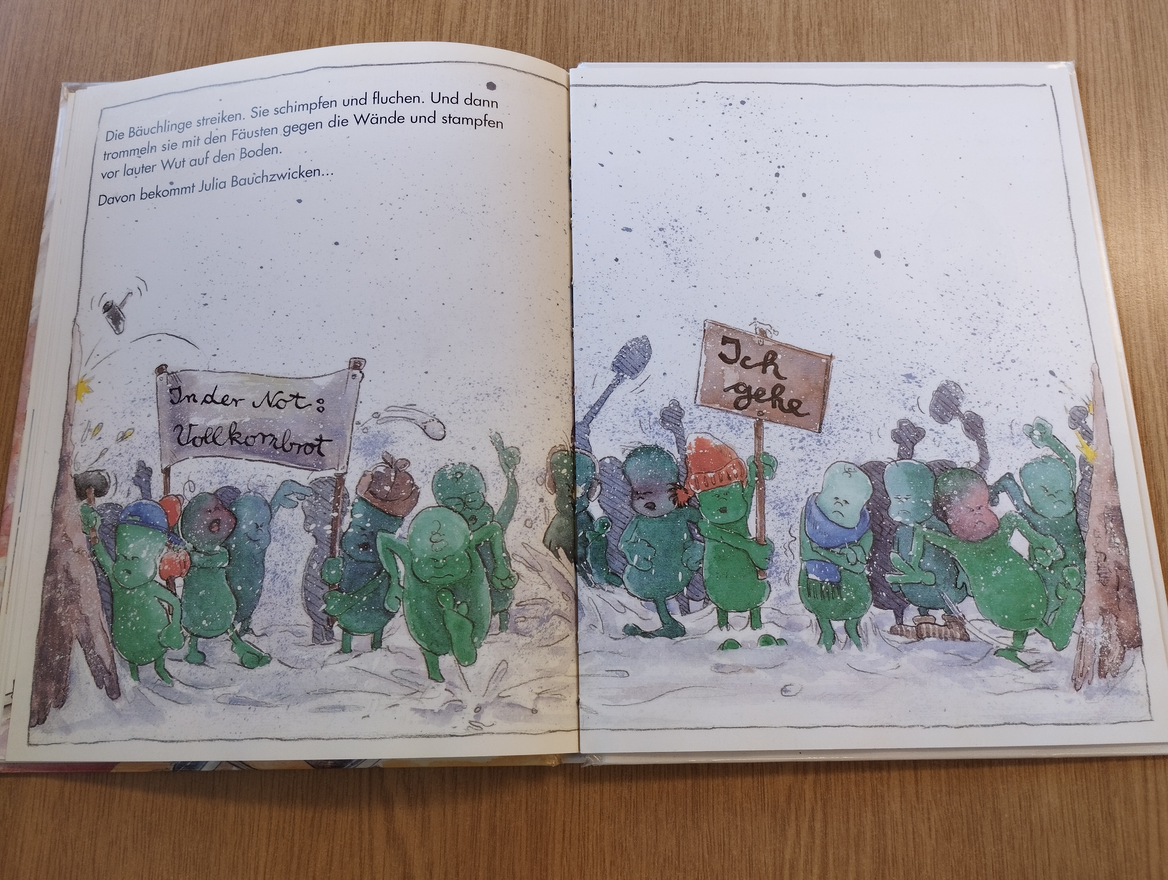 Das Kindergartenkind Julia schlingt beim Essen. Und weil Julia schlingt, fällt das Essen in ihrem Bauch als große Trümmer herab. Und zwar auf den Bahnhof Bauch. Dort arbeiten die Bäuchlinge und sind mit Julias Schlingen schnell überfordert. Zuerst müssen sie sich vor den Riesenbrocken und ewig langen Spaghetti in Sicherheit bringen, bis ein Berg die Schienen lahm legt, dann begräbt auch noch ein Eis alles unter sich. Die Bäuchlinge, deren Arbeit es eigentlich ist, das Gegessene noch ein wenig feiner zu zerteilen, Flüssigkeit im richtigen Verhältnis zuzusetzen und in die Waggons zu verfrachten, die dann ihre Fahrt durch den Darm antreten, fallen um und aus, müssen sich gegenseitig retten und treten schließlich in Streik. Und Julia hat Bauchweh.