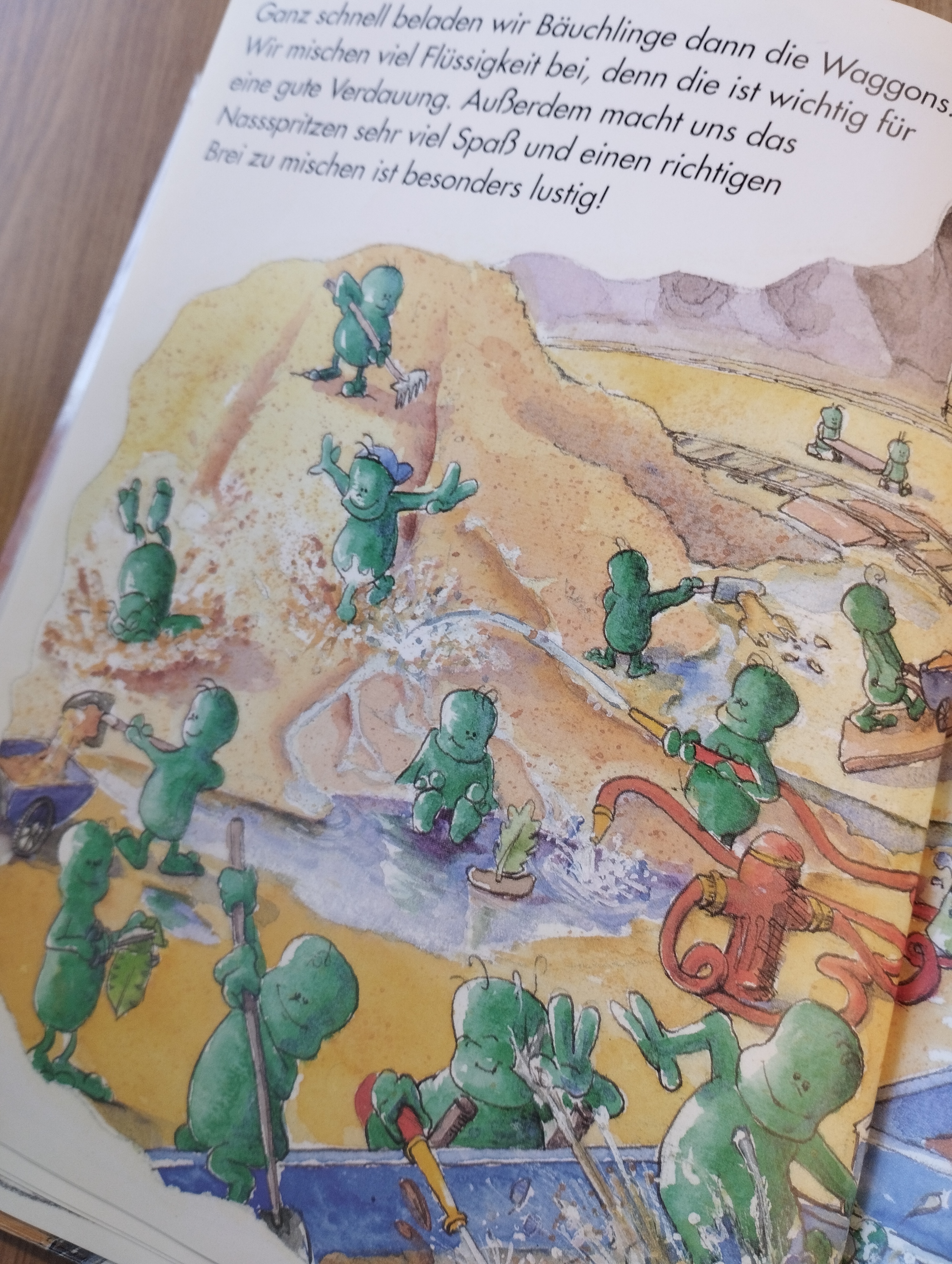 Als Kind bekommt man jedenfalls Lust, richtig zu essen und zu kauen. Nicht aus schlechtem Gewissen den Bäuchlingen gegenüber, sondern weil man den kleinen grünen Arbeiter*innen nur Gutes will, sie zum Beispiel auch einmal faulenzen lassen, wie es im Buch heißt. Und außerdem sieht der fein gekaute Regen, von dem einer der Bäuchlinge träumt, einfach so angenehm aus, dass man am liebsten selbst im Bahnhof Bauch anfangen würde.