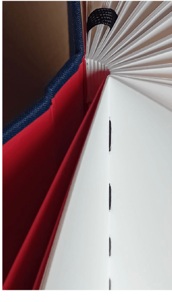 Ein Detail, das besonders praktisch ist: die Schweizer Bindung mit Fadenheftung. Die Seiten liegen flach auf, nichts klappt zu, nichts lenkt vom Schreiben ab.